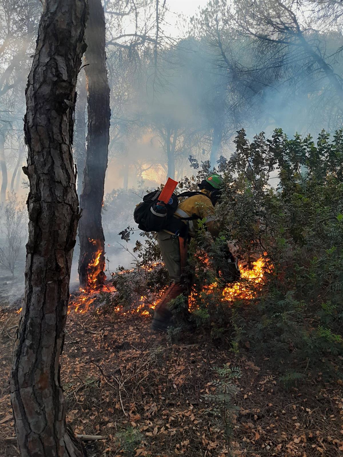 Imagen de uno de los bomberos forestales del Plan Infoca trabajando en la tarde de este pasado miércoles en el incendio de El Portil (Huelva). - PLAN INFOCA