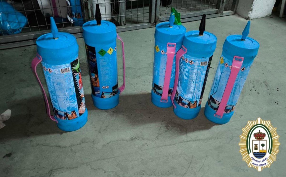 La Policía Local de Punta Umbría (Huelva) ha intervenido en varias operaciones en la localidad botellas de óxido nitroso, el conocido como 'gas de la risa' y advierte del "aumento de su consumo" por parte de los jóvenes, que "emplean esta sustancia como estimulante a través de su inhalación creyendo que es algo inofensivo".