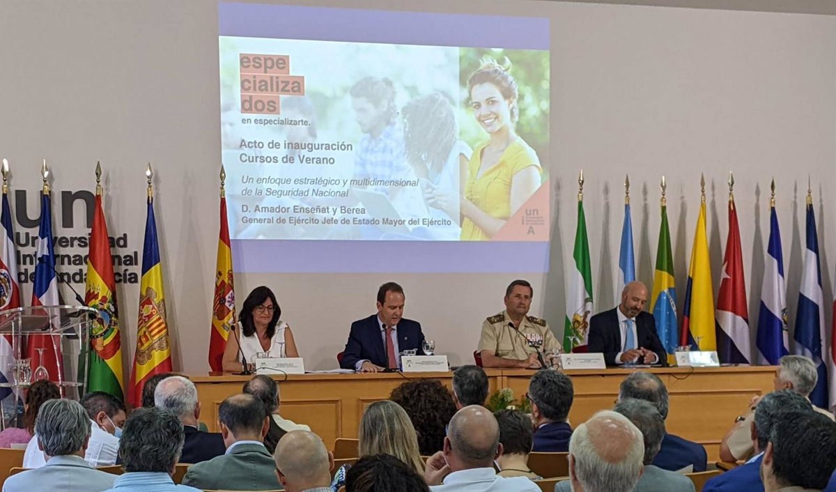 Enseñat y Berea ha sido el encargado de inaugurar los cursos de verano de la UNIA en La Rábida, en Palos de la Frontera (Huelva), con la ponencia 'Un enfoque estratégico y multidimensional de la Seguridad Nacional', durante la que ha asegurado que este concepto "va mucho más allá de la situación de Ucrania o de lo militar" y que "todos los ámbitos de la sociedad están comprometidos con ello".