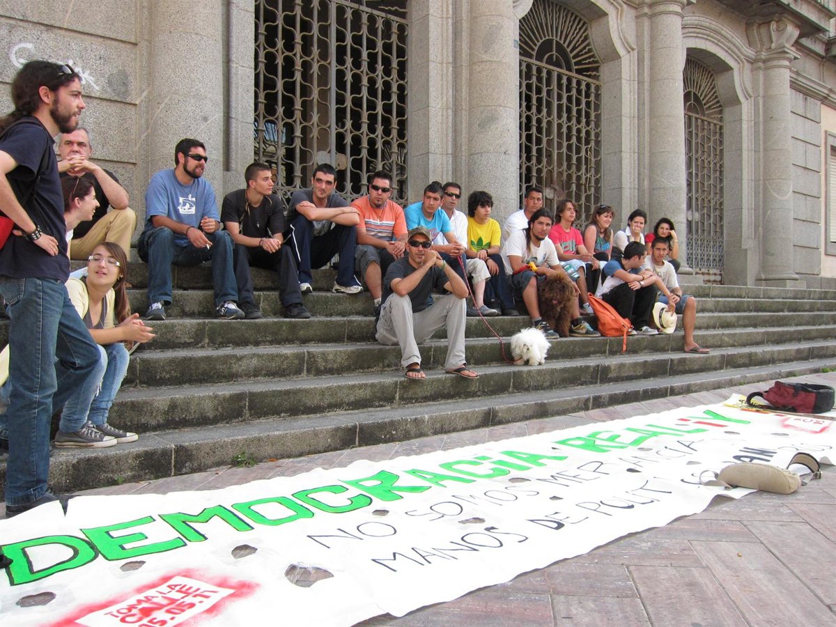 Una veintena de jóvenes onubenses por "una Democracia Real Ya" ha iniciado una acampada en la Plaza de la Constitución frente al Ayuntamiento de la capital en señal de protesta con el sistema financiero actual y con la clase política.