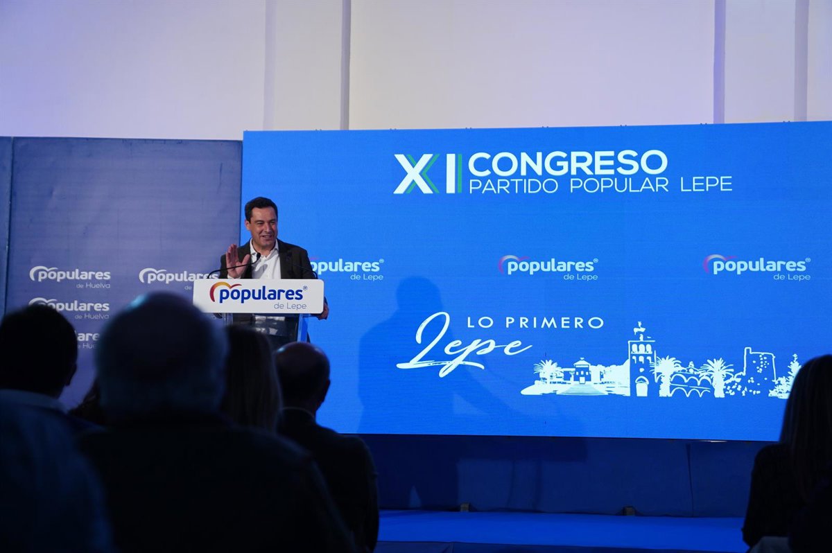 Juanma Moreno, durante su intervención en la clausura del congreso del PP de Lepe (Huelva) - PP-A