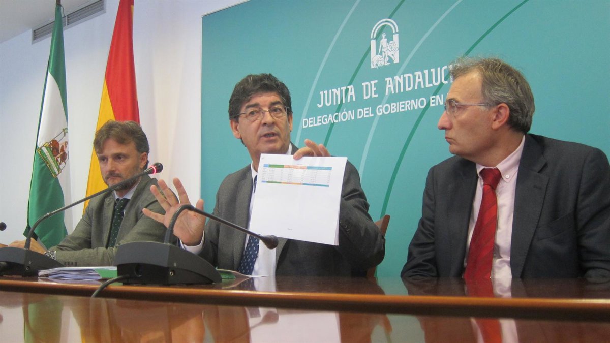 Diego Valderas, acompañado del delegado de la Junta de Andalucía en Huelva, José Fiscal, y el responsable de la Oficina de la Vicepresidencia, Antonio Ramón Marín, ha presentado el proyecto de Ley del Presupuesto, que ha calificado "como el más difícil" de los últimos 30 años.