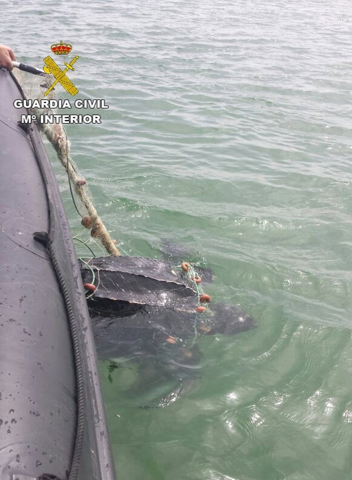 Se envió al lugar a una de las embarcaciones de la Guardia Civil para comprobarlo y una vez localizado el animal, una tortuga de aproximadamente 1,5 metros y unos 250 kilogramos, los agentes comprobaron que estaba totalmente atrapada por el cuello, aletas y caparazón con el cabo de una red de trasmallo ilegal que carecía de señalización alguna.