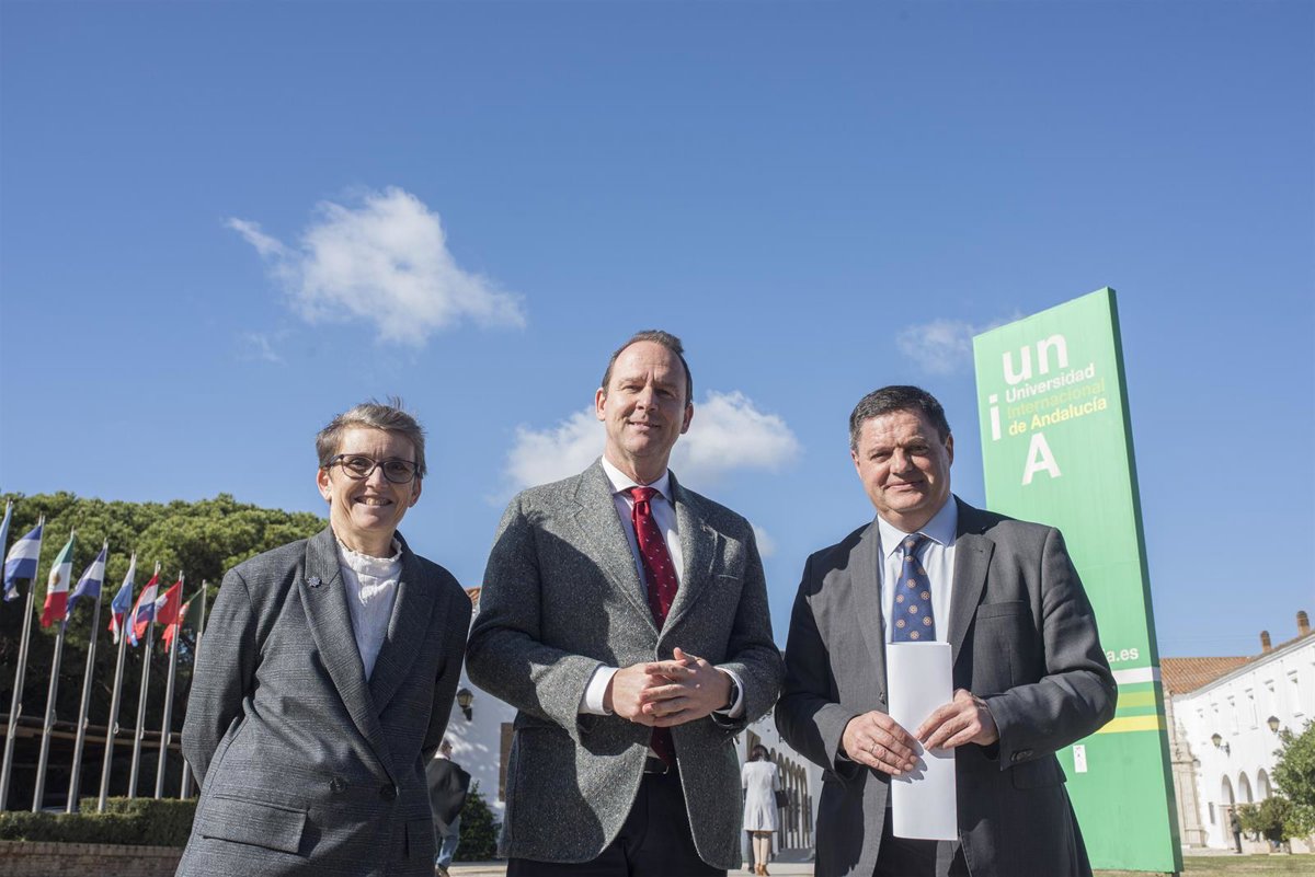 La nueva directora de sede de La Rábida de la Internacional de Andalucía, María de la O Barroso, junto al rector, José Ignacio García, y al director saliente, Agustín Galán. - UNIA