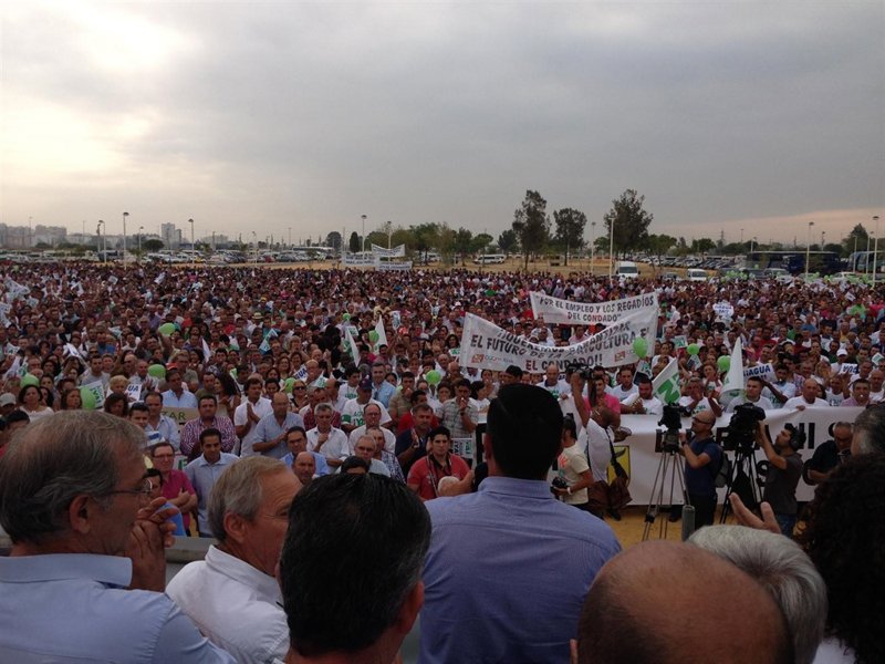 Más de 10.000 personas --hasta 12.000 según la organización y 8.000 de acuerdo con los datos policiales-- se han manifestado este miércoles para pedir "una solución" para los regadíos del Condado, que afectan a los municipios de Moguer, Almonte, Rociana, Lucena y Bonares en el entorno de Doñana.
