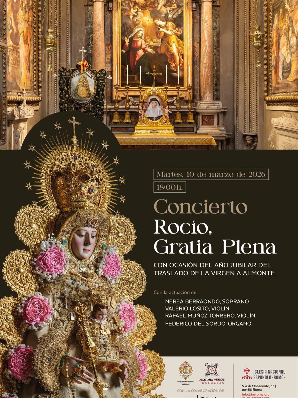 La Hermandad Matriz de Almonte (Huelva) viajará a Roma (Italia) del 10 al 12 de marzo, donde acudirá al concierto 'Rocío, gratia plena' en honor a la Virgen del Rocío con motivo de su traslado desde la aldea al pueblo almoteño --el 19 de agosto-- y del Año Jubilar asociado a él. El concierto se organiza el mismo día 10, a las 18,00 horas, en la Iglesia Nacional Española de Santiago y Montserrat (Via di Monserrato, 115), donde está expuesto al culto público el Simpecado Verde de Almonte.