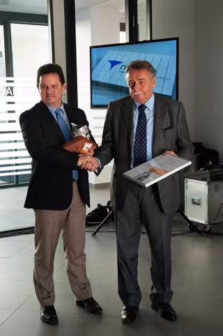 Desde su sede en Barcelona, el director general de MC Mutual, Francisco Hernández Carbo, junto a su equipo, se ha desplazado a las instalaciones de MATSA en Almonaster la Real para hacer entrega en persona del premio al director general de Matsa, Alonso Luján.