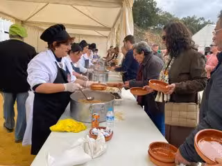 En el mediodía de este pasado sábado, el alcalde de Jabugo, Gilberto Domínguez, ha servido el primer plato de cocido, iniciando así el reparto de las raciones a todos los comensales, servidas junto a la típica 'pringá'. Los asistentes han podido rellenar su plato todas las veces deseadas y acompañarlo, además, con otros productos de la zona como queso, embutidos y jamón ibérico de bellota.