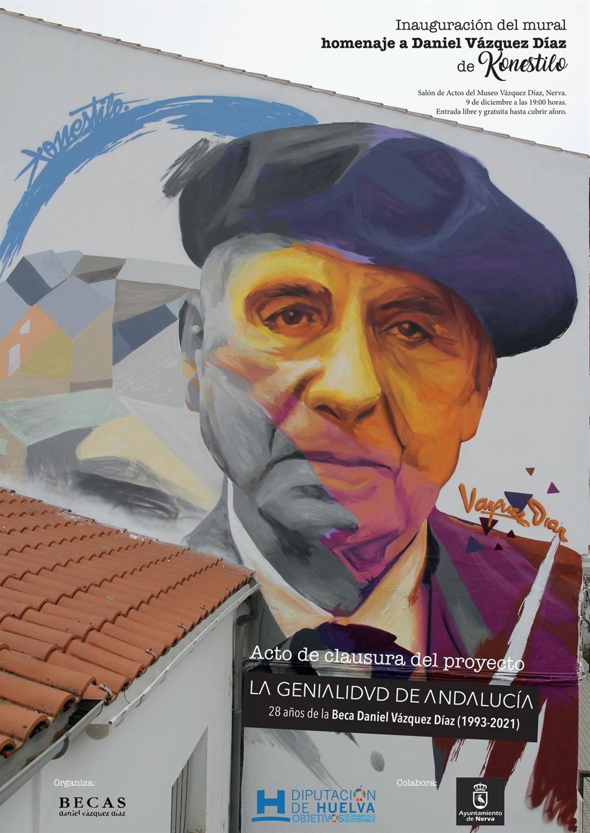 La figura del artista Daniel Vázquez Díaz será literalmente más visible en su Nerva natal. Este jueves a las 19,00 horas, en el entorno del Centro de Arte Moderno y Contemporáneo Daniel Vázquez Díaz, se inaugura un mural homenaje al pintor realizado por el grafitero onubense Víctor Romero, conocido como Konestilo, acto que también servirá de clausura el proyecto 'La genialidad de Andalucía: 28 años de la Beca Daniel Vázquez Díaz'.