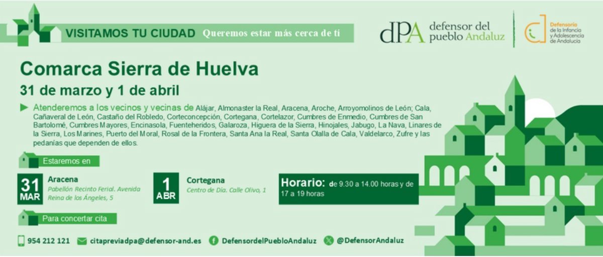 En concreto, la Oficina de Atención Ciudadana del Defensor del Pueblo Andaluz atenderá a los vecinos de la zona el lunes 31 de marzo en Aracena, en el Pabellón del Recinto Ferial, en la avenida Reina de los Ángeles, número 5, y el martes, 1 de abril en Cortegana, en el Centro de Día ubicado en la calle Oliva, número 1. Ambos días, el horario de atención será de 09,30 a 14,00 horas y de 17,00 a 19,00 horas.