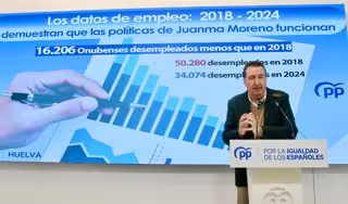 Según informa el PP en nota de prensa, González ha subrayado que en comparación con hace seis años, cuando llegó Juanma Moreno a la Junta de Andalucía, "Huelva ha mejorado los datos de empleo cerrando el año 2024 con 34.074 desempleados, una cifra inferior a los 50.280 parados registrados al finalizar 2018 con el gobierno socialista, lo que supone una reducción de 16.206 onubenses en las listas del SAE, un 32%".