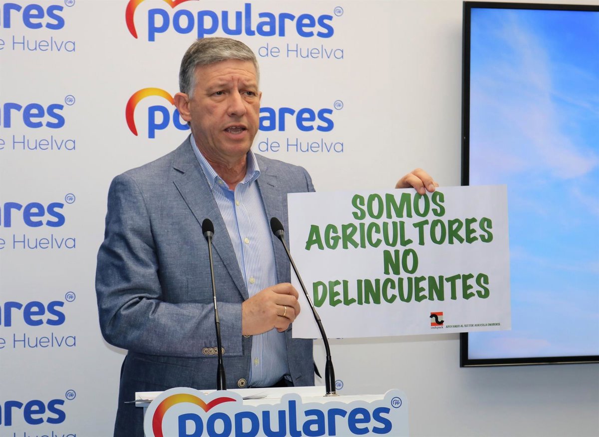 Asimismo, el vicepresidente del PP de Huelva ha propuesto la creación de una "mesa de diálogo" con los agricultores para analizar y plantear alternativas "y evitar protestas y reivindicaciones constantes". "Frente al insulto, el diálogo y el entendimiento", ha recalcado mientras mostraba uno de los carteles que portaban este lunes los miembros de la Asociación de Agricultores del Condado Onubense con el lema "somos agricultores no delincuentes".