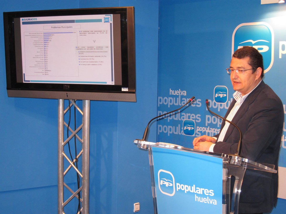 El secretario general del PP-A, Antonio Sanz, ha dado a conocer este lunes los resultados de la encuesta realizada por Sigma Dos y encargada por su formación, que apunta que de celebrarse ahora las elecciones municipales el Partido Popular mantendría la mayoría absoluta en la capital onubense.