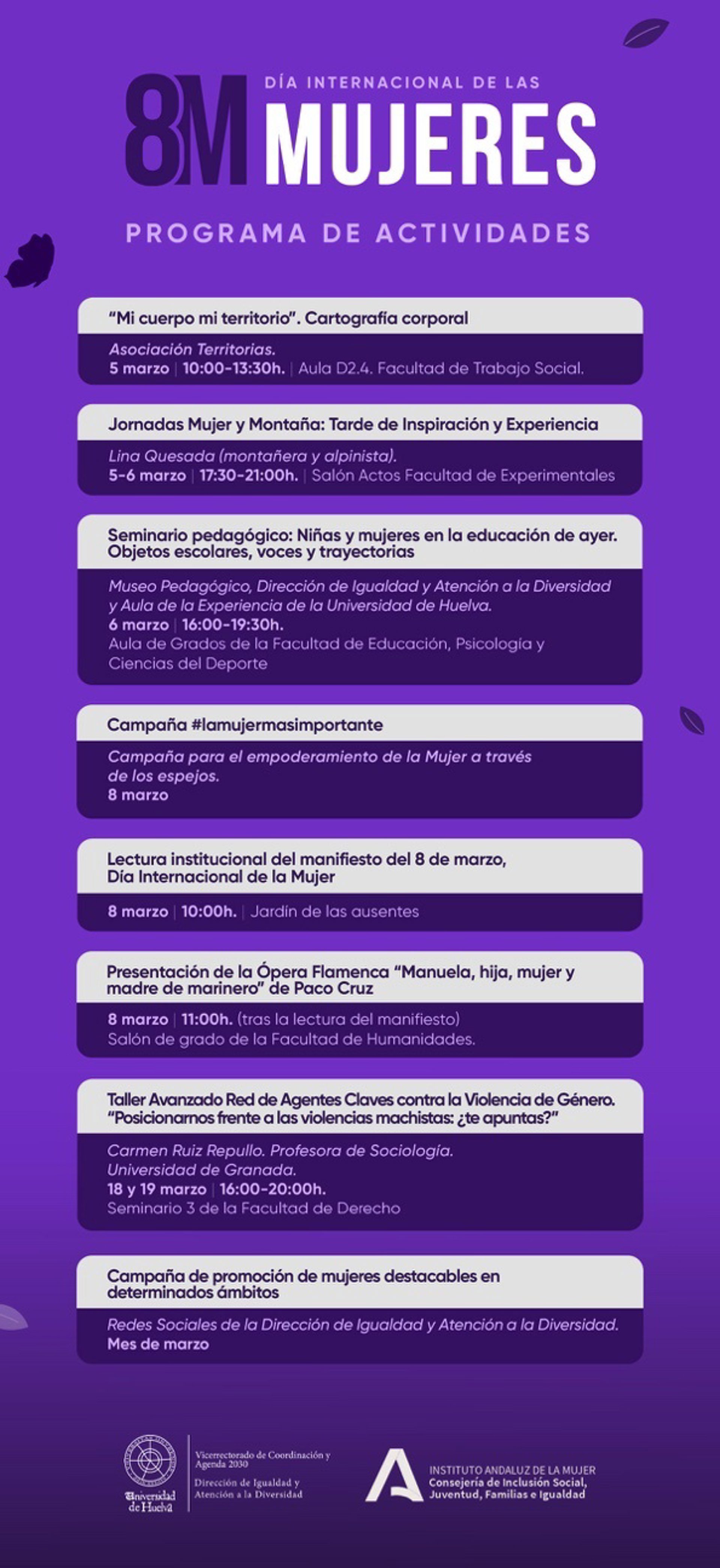 La Dirección de Igualdad y Atención a la Diversidad de la Universidad de Huelva (UHU) desarrolla una programación especial en torno al 8 de marzo, Día Internacional de las Mujeres, que incluye una variedad de actividades sobre "prevención, promoción, divulgación y sensibilización".