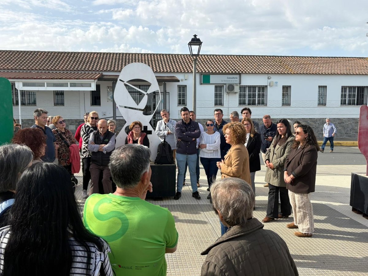 La secretaria general del PSOE de Huelva, María Eugenia Limón, hablando con vecinos a las puertas del centro de salud de San Bartolomé de la Torre. - PSOE DE HUELVA