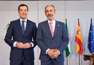 El presidente de la Junta de Andalucía, Juanma Moreno (i), y el nuevo rector de la Universidad de Huelva, José Rodríguez Quintero (d), durante el acto de toma de posesión. - María José López - Europa Press