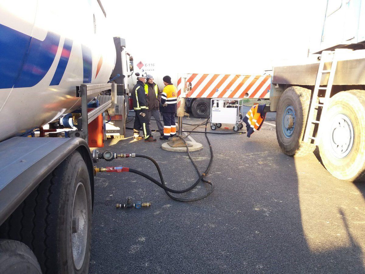 A las 2,40 horas de este martes comenzaron las labores de trasvase de la carga de más de 30.000 litros de gas propano sin mover el camión volcado y sobre las 5,00 horas los especialistas del Consorcio Provincial de Bomberos de Huelva y de una empresa especializadadesplazada a la zona iniciaron las maniobras para voltear la cisterna y proseguir entre las 7,00 y las 11,00 con los trabajos de trasvase del gas a otro camión.