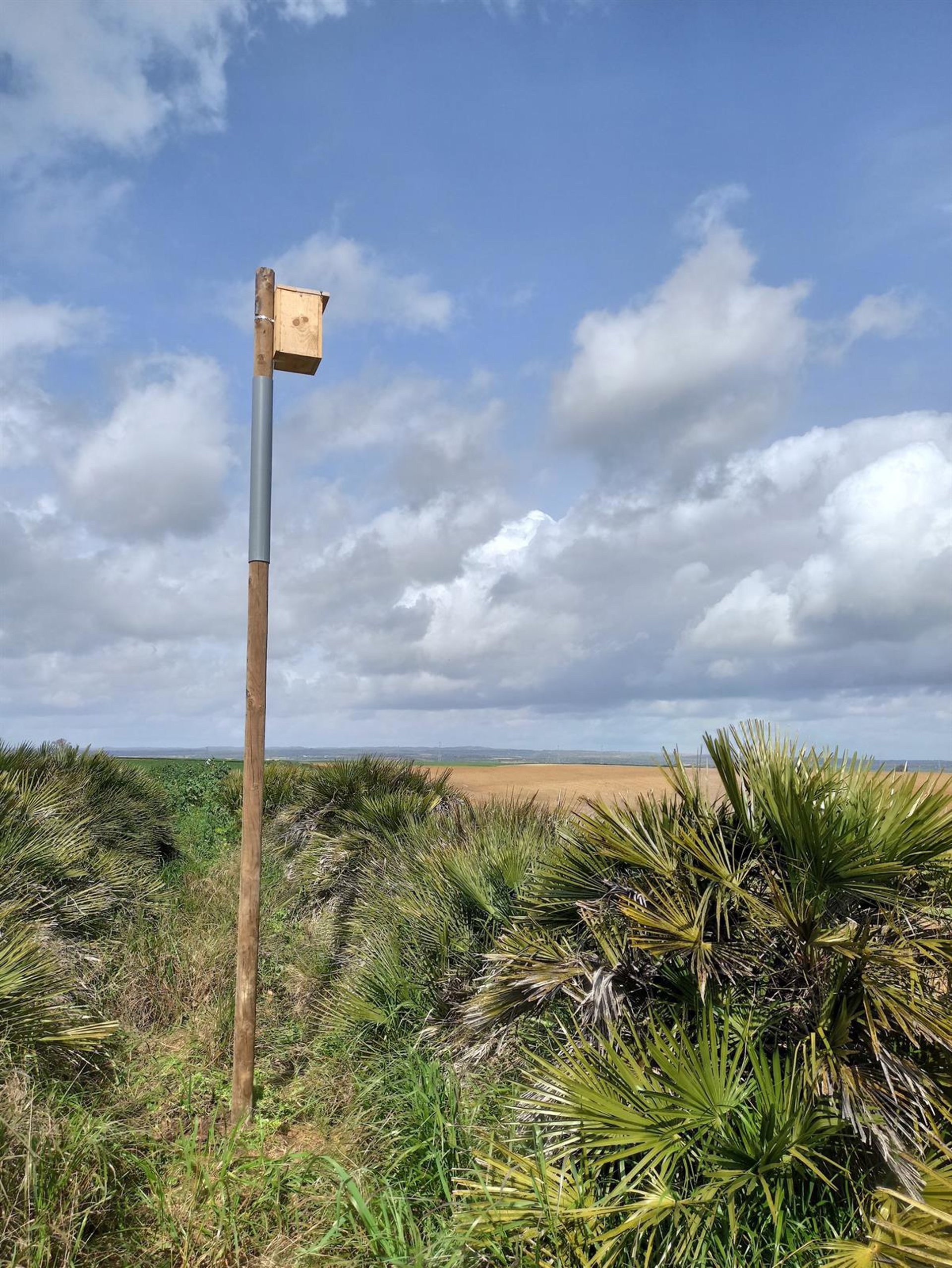 Además, se han colocado seis cajas más, también de fabricación propia, encaramadas en postes de madera, en diferentes enclaves de Campo de Tejada en Escacena del Campo, igualmente en colaboración con Ituci Verde. Estas cajas se diseñaron y colocaron para favorecer la ocupación de parejas de carraca europea.