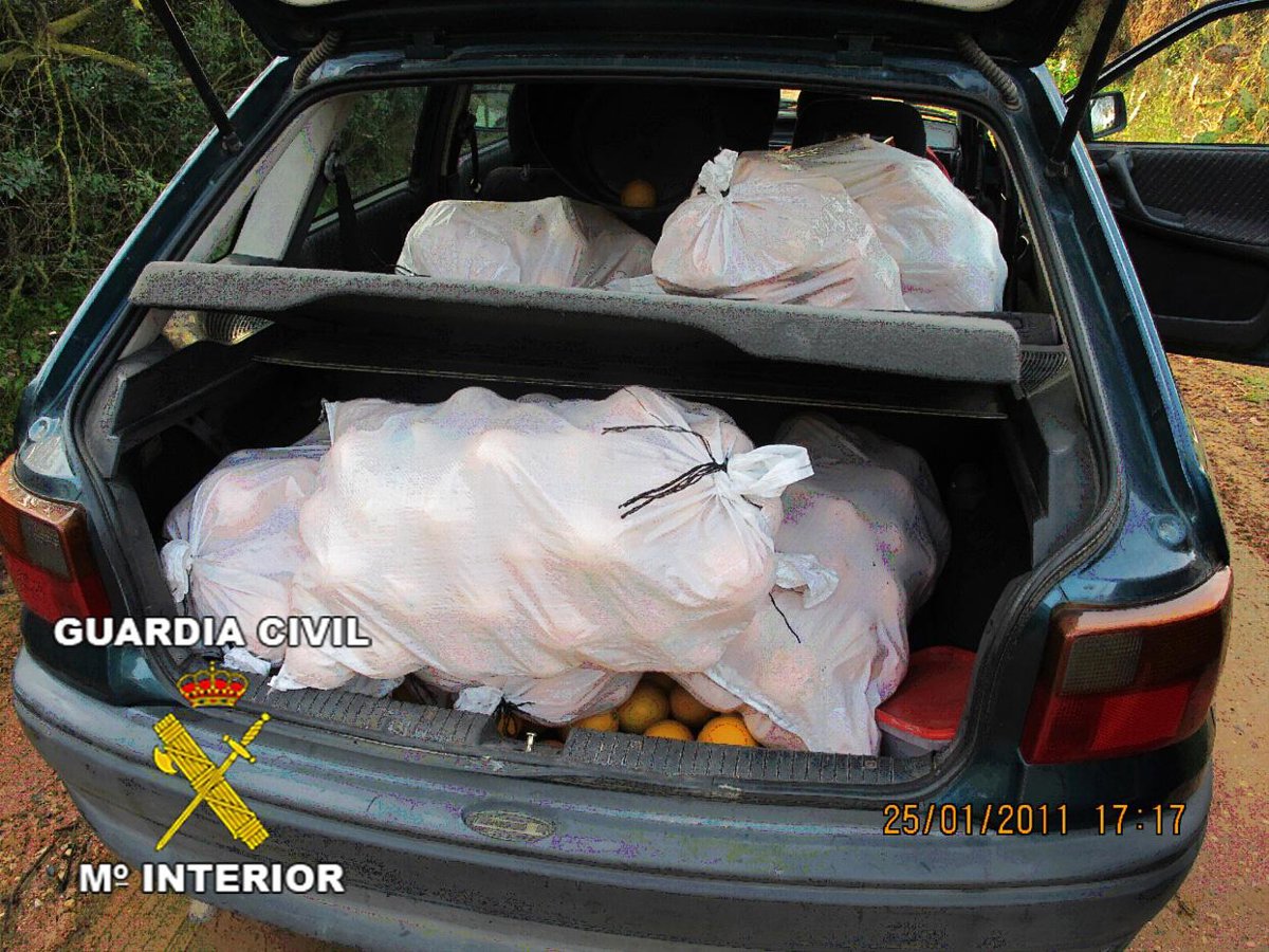 Los agentes identificaron a la referida mujer y de su hermano, quien la acompañaba y en ese momento se hallaba en el interior de la finca. Inspeccionado el interior del vehículo, los guardias civiles observaron como asientos traseros y maletero se hallaban completamente ocupados por sacos de naranjas, así como que en una zona cercana se encontraban más sacos, también llenos y dispuestos para ser cargados.