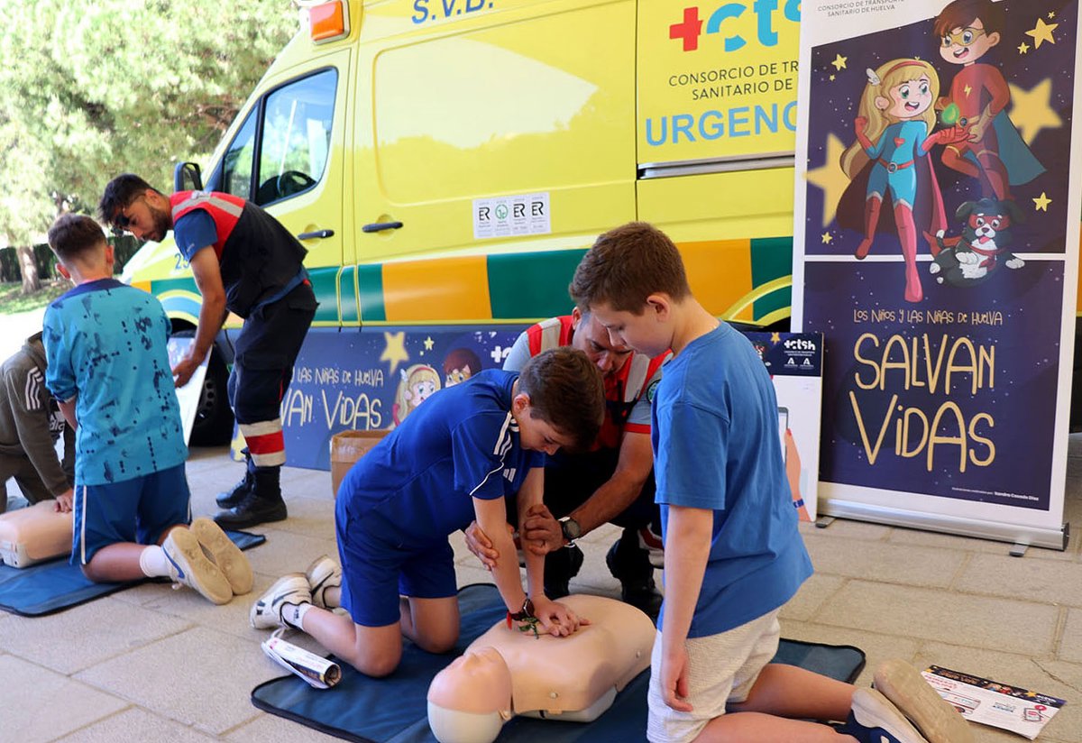 El Consorcio de Transporte Sanitario de Huelva clausura este mes la quinta edición de la campaña escolar y de divulgación sanitaria 'Los niños y las niñas de Huelva salvan vidas', que ha instalado su Aula Móvil bajo las carpas de la Avenida de Andalucía de la capital para formar en el curso 2024-2025 a 3.000 estudiantes de 32 centros de 15 municipios en 30 jornadas formativas en plazas, colegios e institutos.