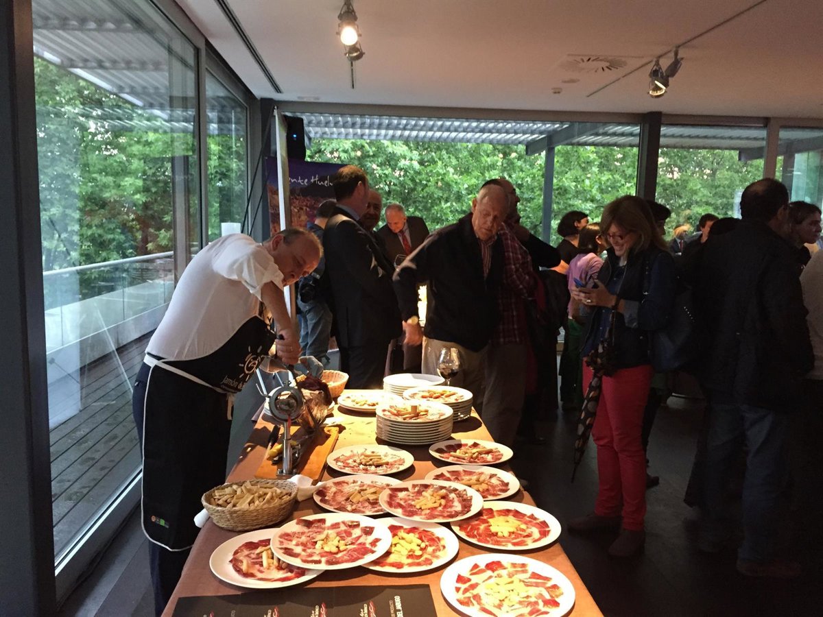 Haciendo las "delicias" del público asistente, el cocinero del restaurante 'Arrieros' de Linares de la Sierra ofreció una selección de sus creaciones culinarias a base de 'carpaccio' de presa ibérica, foie y vinagreta del Condado, sardina marinada con mermelada de pimiento y berenjena, crema de boletus y papada ibérica, prueba de manzana y puré de papas, hamburguesas de pluma y setas y geleé de tinto del Condado y orejones con membrillo y cítricos. Todo ello acompañado por el "inigualable" Jamón DO Jabugo, de la mano de un "experto" cortador, las gambas blancas de Huelva y los vinos de la DO Condado de Huelva servidos por una venenciadora.