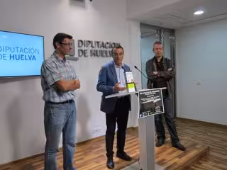 El presidente de la Diputación y del Patronato de Turismo, Ignacio Caraballo, el alcalde de Santa Ana La Real (Huelva), José Antonio Ramos, y Juan Antonio Jara, gerente de la empresa Diávolo Producción Cultural, han presentado este jueves la primera Ruta de Senderismo con señalización nocturna.