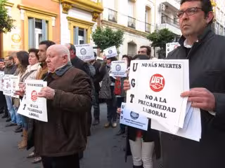 Representantes de UGT se han concentrado este jueves durante cinco minutos frente a la sede del sindicato en señal de protesta por el último accidente laboral mortal ocurrido en la capital. El trabajador, un policía nacional, de 34 años, falleció este miércoles en un accidente de tráfico ocurrido a las 8,50 horas en la Avenida Julio Caro Baroja de la capital de Huelva, por la colisión de un turismo con una motocicleta, que conducía el fallecido, cuando se dirigía a la Comisaría para comenzar su jornada laboral.