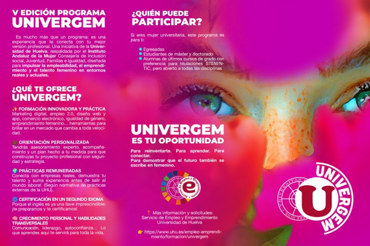 El Servicio de Empleo y Emprendimiento de la Universidad de Huelva (UHU), en colaboración con el Instituto Andaluz de la Mujer (IAM) de la Consejería de Inclusión Social, Juventud, Familias e Igualdad de la Junta de Andalucía, ha abierto el plazo de inscripción para la V edición del Programa Univergem --Universidad de Huelva por la Empleabilidad y el Emprendimiento de las Mujeres Universitarias desde la Perspectiva de Género--.