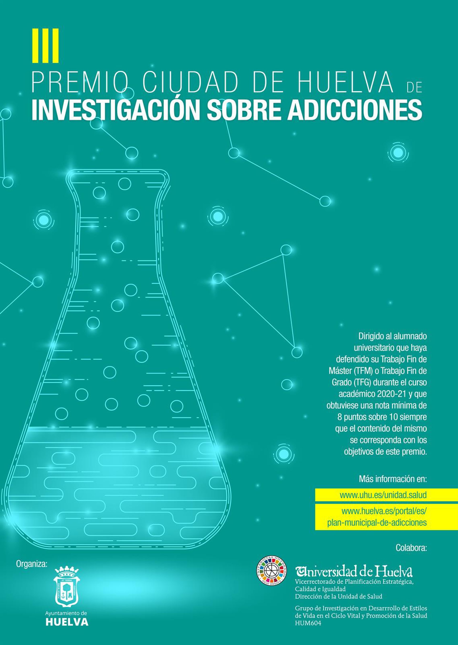 La Concejalía de Políticas Sociales e Igualdad del Ayuntamiento de Huelva ha convocado la tercera edición del 'Premio Ciudad de Huelva de Investigación sobre Adicciones', una iniciativa municipal que se desarrolla en colaboración con la Universidad de Huelva a través de la Unidad de Salud y del Grupo de Investigación en Desarrollo de Estilos de Vida en el Ciclo Vital y Promoción de la Salud, con el objetivo de fomentar en la comunidad universitaria la investigación y el estudio en el campo de las adicciones e impulsar la elaboración de trabajos sobre las diferentes dependencias, centrados en la ciudad de Huelva.