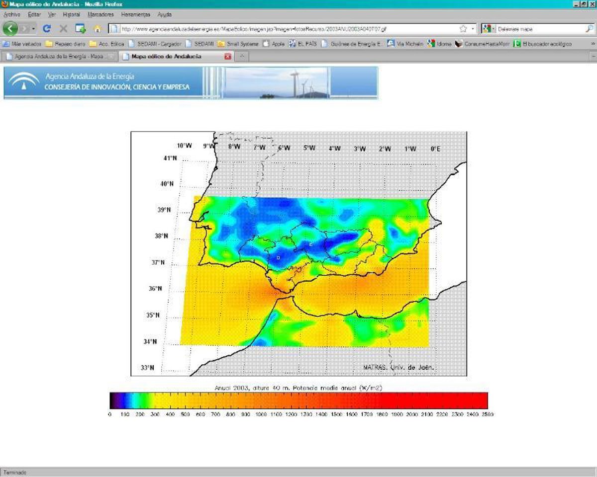 Según explicó, anteriormente se habían elaborado mapas de recurso eólico basados en datos con escasa precisión que se recogían de instalaciones eólicas existentes que facilitaban una idea de las zonas donde había suficiente recurso. Sin embargo, la Agencia Andaluza de la Energía ha elaborado unos mapas de recurso eólico con resolución espacial de 15 kilómetros y temporal de una hora, resultado de una serie de simulaciones de viento con un modo meteorológico que permite estimar el potencial eólico existente, validadas con datos reales de los años 2003 y 2004.