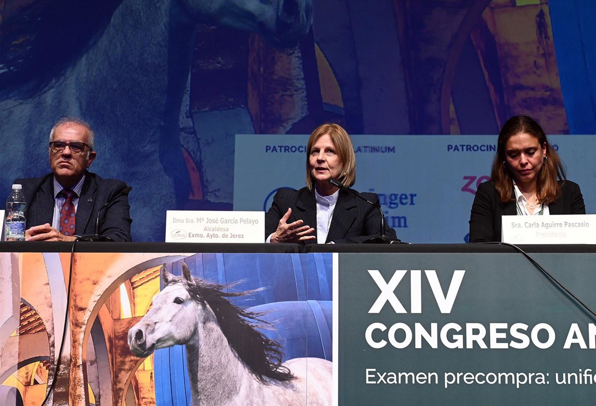 La alcaldesa de Jerez de la Frontera, María José García-Pelayo, junto a la presidenta de la Asociación de Veterinarios Especialistas en Équidos de España (AVEE), Carla Aguirre, ha inaugurado oficialmente este jueves el XIV Congreso Anual de la Asociación de Veterinarios Especialistas en Équidos de España (AVEE), donde ha apostado por la recuperación de la Red Europea de Ciudades del Caballo para dinamizar el sector.