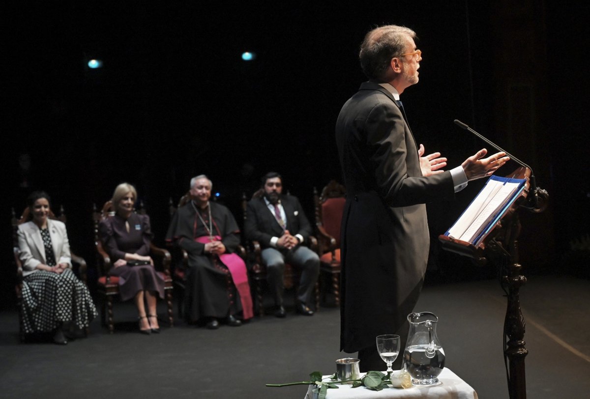 En contexto, Juan Mera Gracia ha sido presentado por la cofrade Rocío Navarro, que ha acompañado a María José García-Pelayo; al presidente de la Unión de Hermandades, José Manuel García-Cordero, y al obispo de la Diócesis, monseñor Rico Pavés en la presidencia del pregón ubicada en el escenario del Teatro Villamarta.