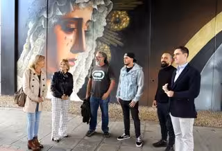 La visita ha contado con la presencia de los tres artistas, que han sido felicitados por el teniente de alcaldesa Jaime Espinar, y la delegada de Participación y Juventud Carmen Pina, junto al hermano mayor de Las Viñas, Manuel Tristán. El mural, en el que se ha reflejado el rostro de la Virgen de la Concepción, un paisaje de viñas, y el Dios Baco, ha despertado una gran expectación, dada su belleza, y el emplazamiento elegido, muy cerca del barrio y de la Parroquia de las Viñas.