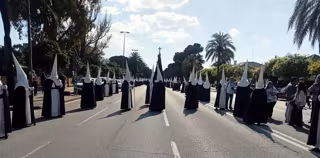 Nazarenos de la Hermandad de La Entrega buscando el centro de Jerez por la Avenida Domecq a las cuatro de la tarde del Sábado de Pasión. - EUROPA PRESS