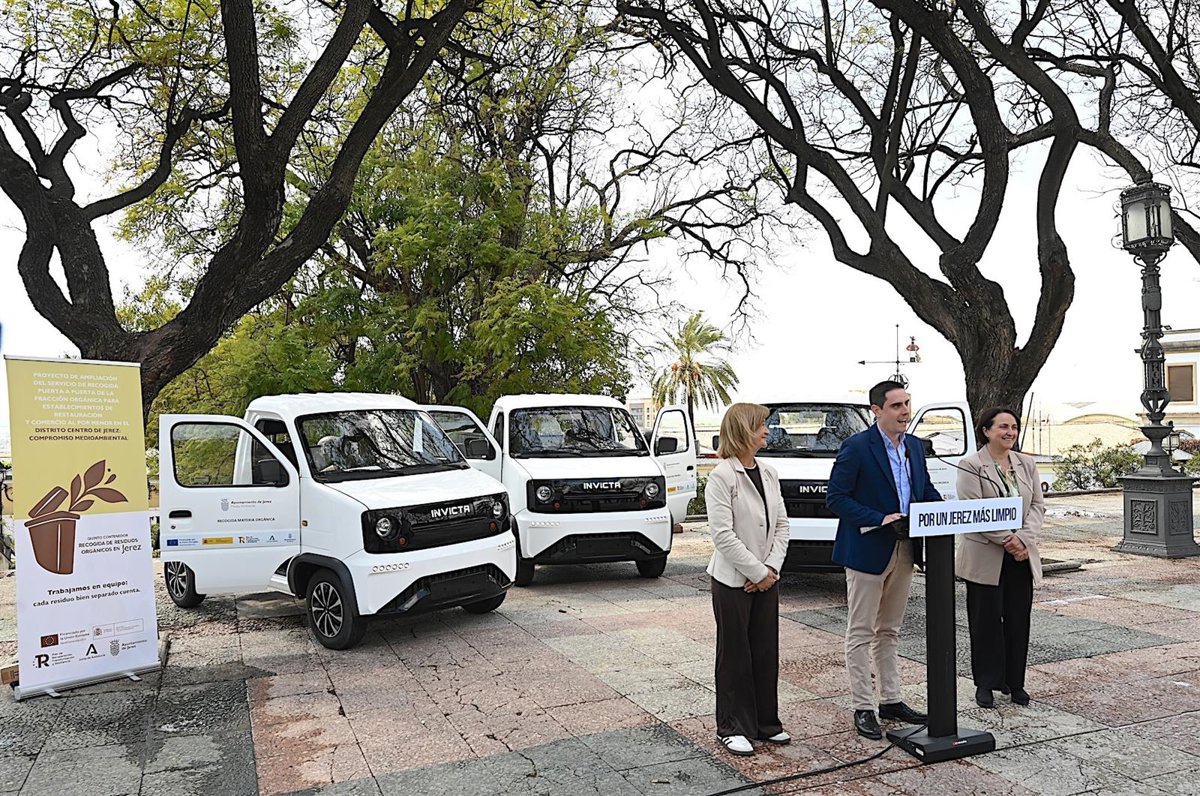 El teniente de alcaldesa de Coordinación de Servicios Públicos y Medio Ambiente en el Ayuntamiento de Jerez de la Frontera (Cádiz), Jaime Espinar, ha presentado este lunes los tres vehículos recolectores 100% eléctricos que permitirán poner en marcha el servicio de recogida selectiva de residuos orgánicos para unos 500 establecimientos de hostelería y comercio de la zona centro de la ciudad mediante la recogida puerta a puerta.