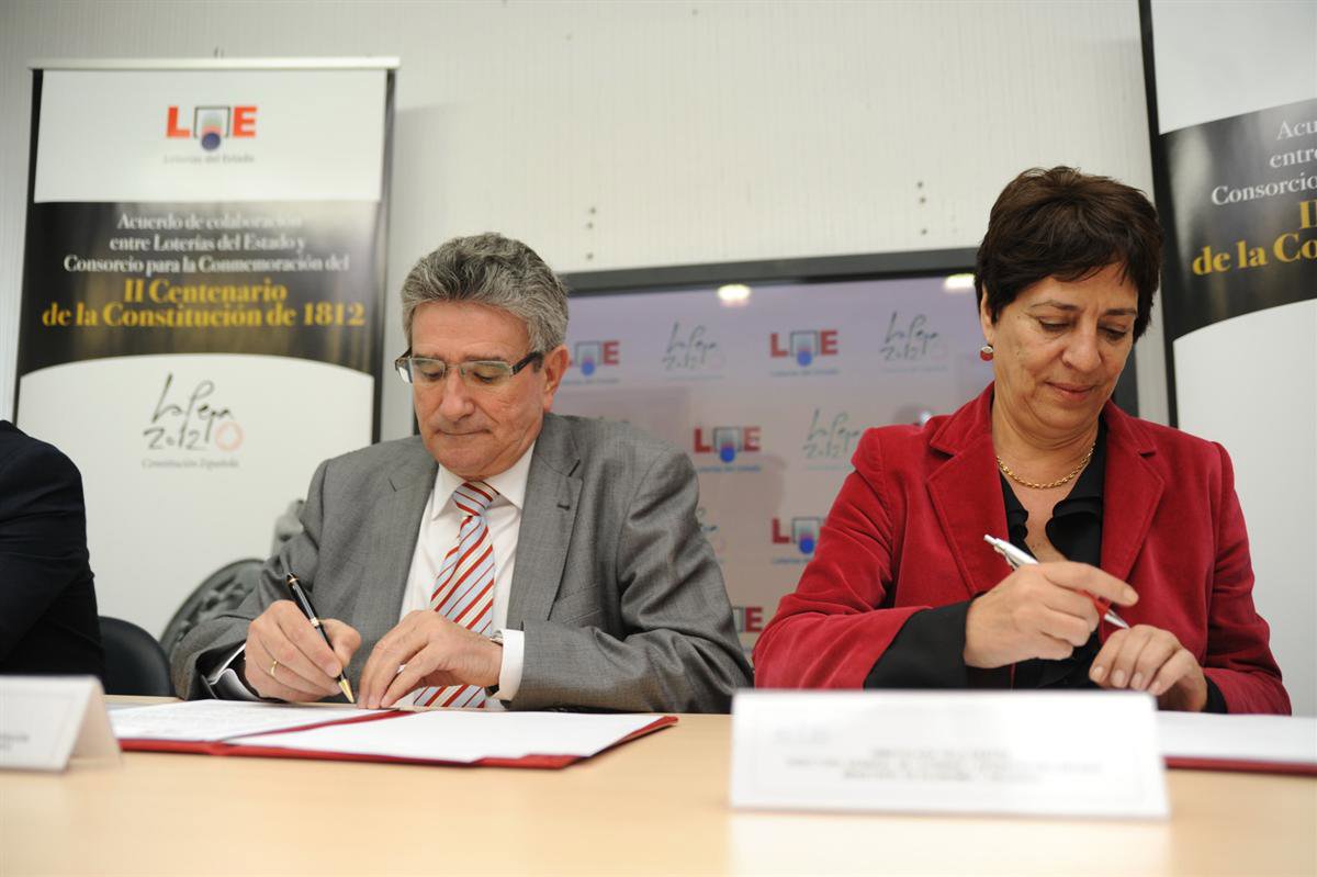 El presidente del Consorcio para la Conmemoración del Bicentenario de la Constitución de 1812, Luis Pizarro, y la directora general de la entidad pública empresarial Loterías y Apuestas del Estado, Inmaculada Vela, han firmado un convenio mediante el que dicha entidad, que se va a constituir en breve como Sociedad Estatal, se suma al Doce como colaboradora y patrocinadora de actividades académicas, culturales, deportivas, de ocio e institucionales que se organicen con motivo de la celebración de los 200 años de la primera Carta Magna de España e Iberoamérica.