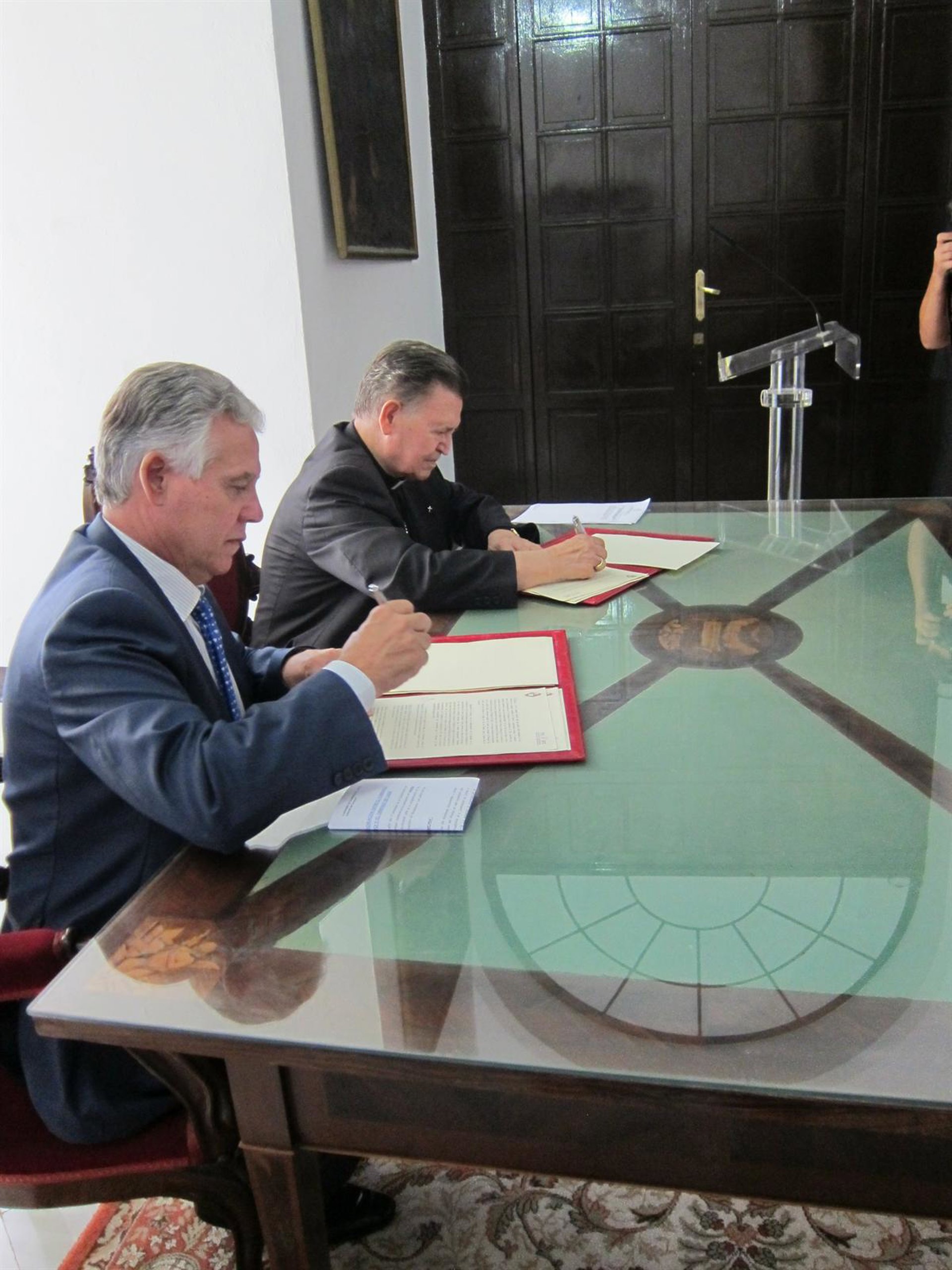 El presidente del Consorcio para la Conmemoración del II Centenario de la Constitución de 1812 y consejero de Gobernación y Justicia de la Junta de Andalucía, Francisco Menacho, y el Obispo de la Diócesis de Cádiz y Ceuta, Antonio Ceballos, han firmado este miércoles un convenio de colaboración mediante el cual la Iglesia cede el uso del Oratorio San Felipe Neri para la celebración de actos institucionales y culturales incluidos en la programación de La Pepa 2012.