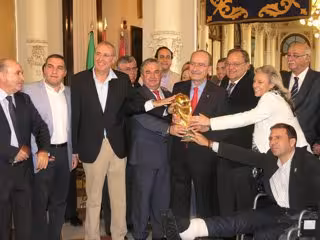 El alcalde de la capital, Francisco de la Torre, recibió este sábado la Copa del Mundo, en un acto en el que estuvo el presidente de la Federación Andaluza de Fútbol, Eduardo Herrera, el presidente de la Diputación, Salvador Pendón, y el delegado de Juventud, Comercio y Deporte, Antonio Souvirón; entre otros.