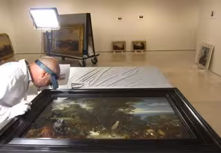 Tras la apertura de las cajas y la retirada de la protección por parte de los operarios del museo, siempre bajo la supervisión de la responsable del Registro del Thyssen, Maura Verástegui; de la técnico de Conservación y encargada de las exposiciones temporales, María Sanz, y de la propia Lourdes Moreno, los restauradores comprueban minuciosamente, con gafas de aumento y focos cegadores, la obra y también su marco, completando el informe de estado de conservación.