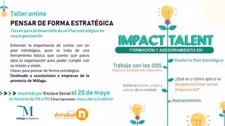 La Diputación de Málaga junto a la Asociación Arrabal AID ponen en marcha, el próximo 20 de mayo, la segunda fase formativa 'Pensar de forma estratégica' del proyecto Impact Talent, iniciativa cuyo objetivo es incentivar el desarrollo social y económico de municipios menores de 20.000 habitantes a través de formación y asesoramiento a entidades sociales y empresas de la provincia, haciendo hincapié en las que se encuentran ubicadas en la comarca del Valle del Guadalhorce.