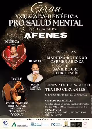 Afenes Málaga ha organizado para este lunes, 7 de octubre, una gala solidaria Pro Salud Mental que se celebrará en el Teatro Cervantes de la capital malagueña con el objetivo de recaudar fondos para los programa que tiene en marcha y también para concienciar sobre la importancia de la salud mental en todos los ámbitos, también en el laboral.
