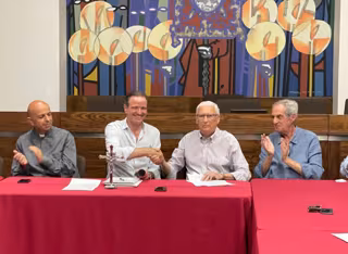 El presidente de la Agrupación de Cofradías, Pablo Atencia; el presidente de la comisión del Centenario, Luis Merino; el director del Comedor Santo Domingo, Damián Lampérez; así como el presidente del Patronato del Comedor, Alfonso Parejo, en un acto. - AGRUPACIÓN DE COFRADIAS