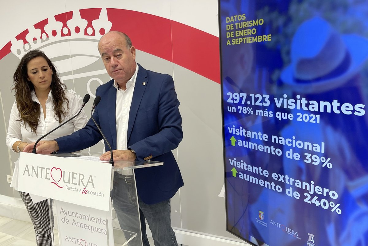 El alcalde de Antequera (Málaga), Manuel Barón, y la teniente de alcalde delegada de Turismo, Ana Cebrián, han informado de los datos más relevantes del turismo entre los meses de enero y septiembre del presente año 2022 y han valorado que "Antequera casi duplica ya el número de visitas registradas respecto a los tres primeros trimestres del año anterior".