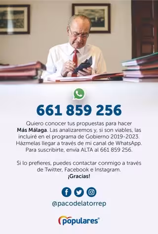 De la Torre lanzó este pasado lunes el canal de mensajería instantánea para conocer propuestas y aportaciones de la ciudadanía a través del número de teléfono 661 859 256, ideas que se analizarán y, si son viables, se incluirán en su programa de gobierno. Para suscribirse hay que enviar la palabra ALTA al citado número. Esta medida se suma a las cuentas de Twitter, Facebook e Instagram del regidor malagueño y candidato.