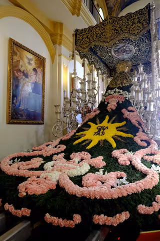 Desde los años 40, la Virgen de las Penas, por un acuerdo de los hermanos de la Cofradía, luce este peculiar manto de flores que durante la procesión del Martes Santo es motivo de curiosidad tanto para devotos como para visitantes de la Semana Santa malagueña.