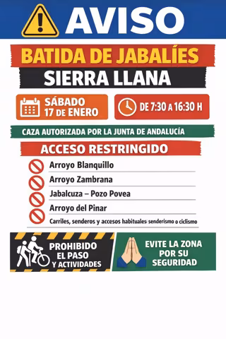 Según la comunicación oficial registrada en el Ayuntamiento, la batida implica un despliegue amplio y continuo durante toda la jornada. Por motivos de seguridad, el Ayuntamiento ruega evitar cualquier tipo de presencia o actividad en la sierra durante el horario indicado.