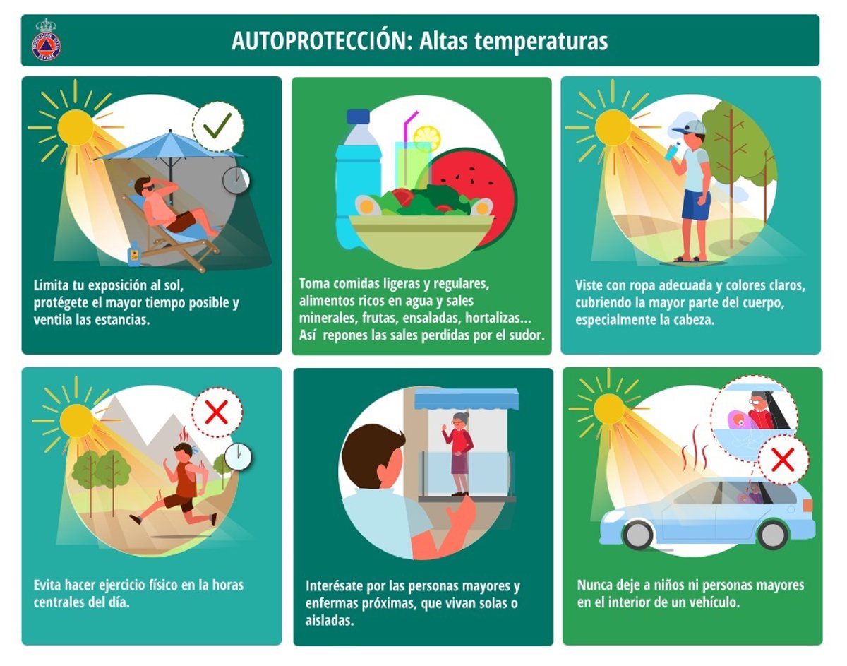 También recomiendan evitar ejercicios físicos prolongados en las horas centrales del día; interesarse por las personas mayores y enfermas, y aquéllas que vivan solas o aisladas; y tener en cuenta que las altas temperaturas favorecen el riesgo de incendios forestales.