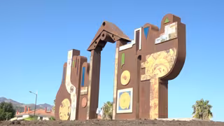 La escultura instalada en la glorieta es una obra de cerámica y acero corten realizada por la ceramista local Sandra Martínez Céspedes que representa un gran portón, simbolizando la entrada a Alhaurín de la Torre. - AYUNTAMIENTO DE ALHAURÍN DE LA TORRE