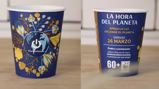 Diseñado con motivos de la naturaleza sobre un fondo azul, el vaso recoge información para animar a sus usuarios a sumarse a este evento simbólico por el que se invita a los consumidores de todo el planeta a rebajar su consumo de energía y, en especial, a apagar las luces el día 26 de marzo, entre las 20:30 y las 21.30, horario local; un gesto que cada vez cuenta con más apoyos tanto a nivel nacional como internacional.