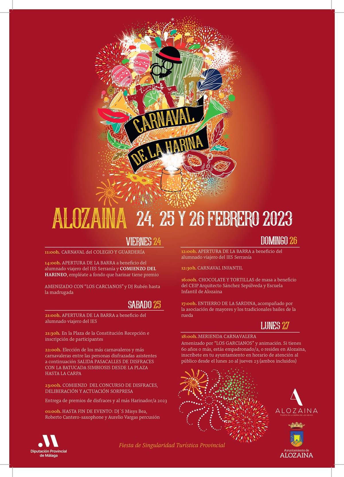 El municipio malagueño de Alozaina comienza este viernes la celebración de su tradicional Carnaval de la Harina, que está declarada como Fiesta Singular de Interés Turístico por la Diputación de Málaga desde 2011 y cuyo origen se remonta a finales del siglo XV. Es la primera celebración del calendario festivo del municipio y una de las fiestas más importantes de la comarca.